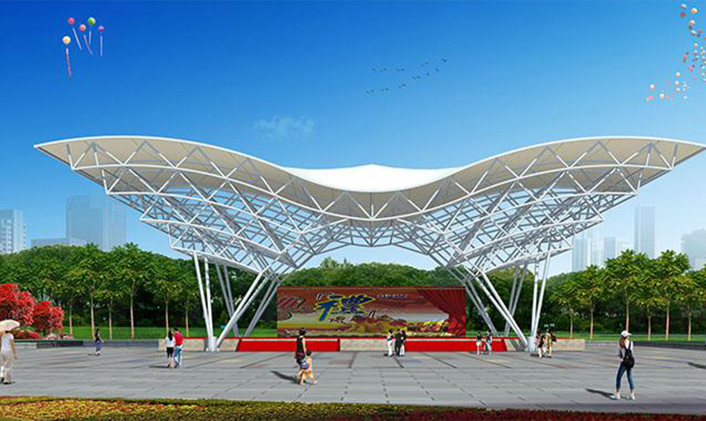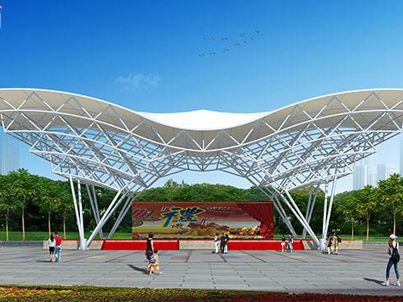 1、舞臺(tái)張拉膜結(jié)構(gòu)的共同曲面外形使其具有激烈的雕塑感,膜面經(jīng)過張力到達(dá)自平衡。