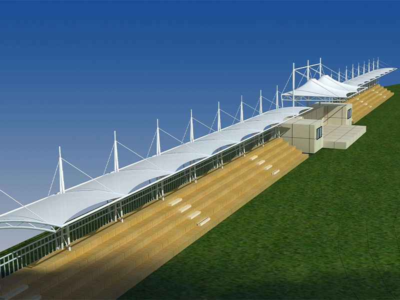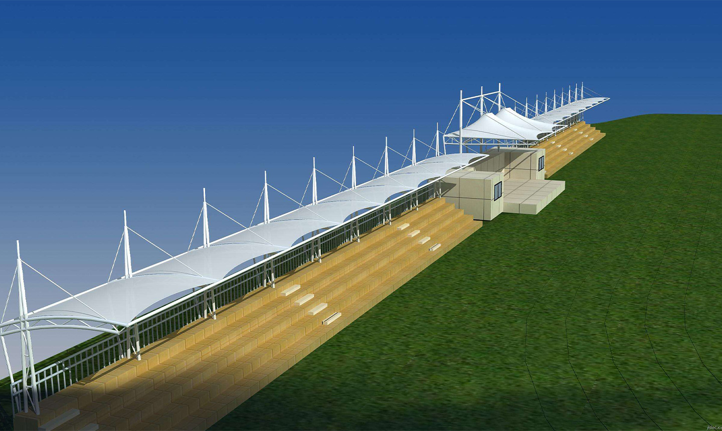 2、體育膜結構看臺的外觀設計一向都是露天的,所以在設計的時候我們需要注意它的承重力,因為一般都是單側建造或者環繞建造,必須有無數個支撐點才能讓整個頂子具有強抗風、抗震的功能 體育場看臺一般都是高大上的感覺,外觀別具特色,實用性也不錯。同時這種看臺在夏季比賽的時候,觀眾特別希望可以坐在遮陽效果好的一面,那么我們就需要把這些因素考慮進去。盡量讓設計大面積的有遮陽效果,最后在膜結構裁剪的時候要量好尺寸,這樣每塊材料才能很好的焊接成功。做到這些,一個完美又實用的體育場看臺就會很快展現在眼前了。