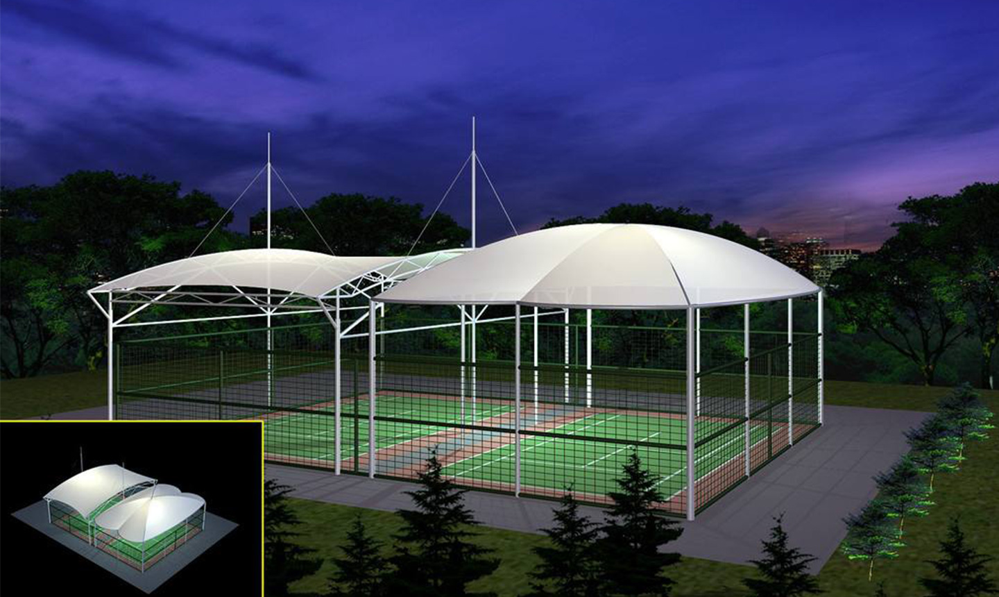 一、對于場地要求低,基本上所有球場地都可以做膜結構頂棚,相比混凝土結構的風雨球館,施工周期短,造價低。