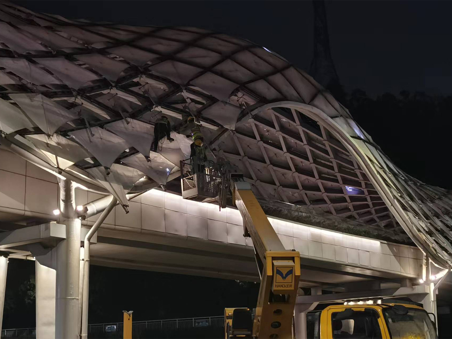 在生產(chǎn)制造方面,為了保證膜結(jié)構(gòu)安裝質(zhì)量和使用年限,遠(yuǎn)信膜結(jié)構(gòu)工程公司采用了現(xiàn)代化的生產(chǎn)車間,公司擁有完整的專業(yè)膜材檢測(cè)設(shè)備、自動(dòng)裁剪設(shè)備、大型軌道行走式PTFE及PVDF熱合設(shè)備。同時(shí),公司擁有豐富的膜結(jié)構(gòu)計(jì)算分析、設(shè)計(jì)與施工經(jīng)驗(yàn),集設(shè)計(jì)、制作、安裝為一體。
